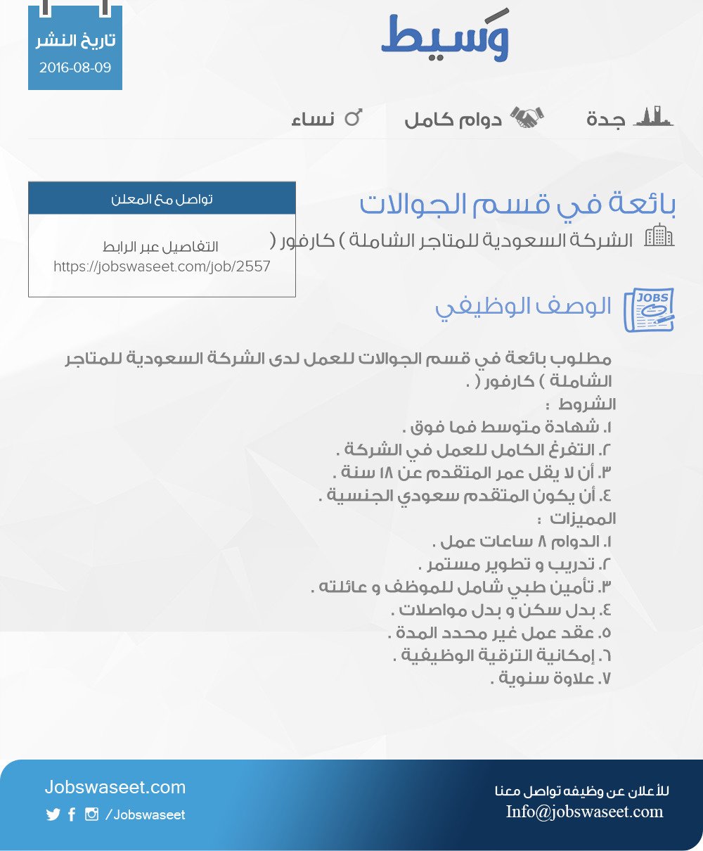وسيط وظائف On Twitter وظيفة بائعة في قسم الجوالات الشركة السعودية للمتاجر الشاملة كارفور جدة Https T Co Qgfc17q5jp