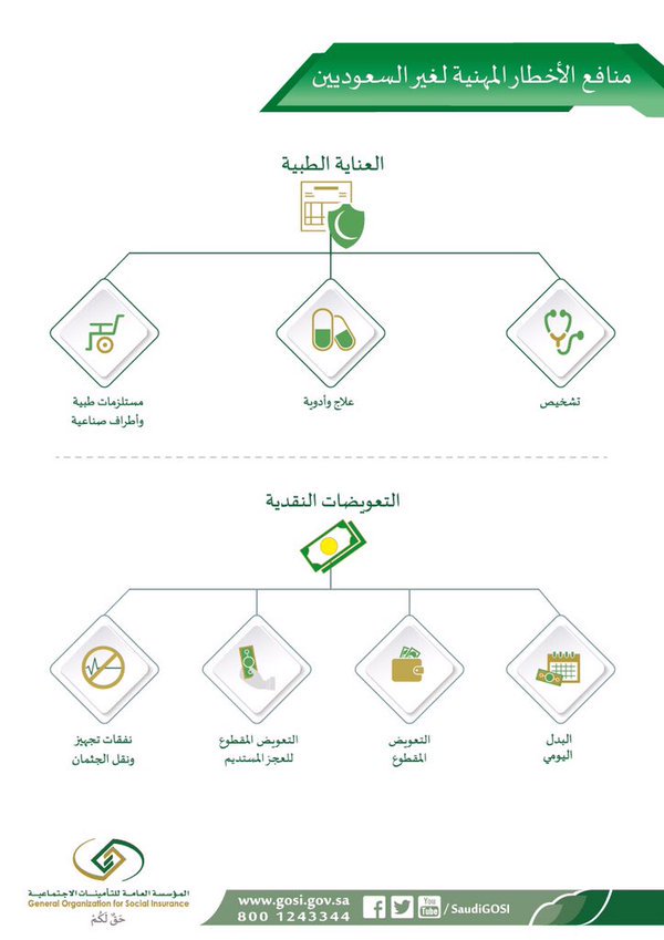 التأمينات الاجتماعية V Twitter يطبق فرع الأخطار المهنية على غير السعوديين ويمكن للمشترك الاستفادة من المنافع التي يقدمها فرع الأخطار المهنية في حال تعرضه لإصابة عمل لا سمح الله ولمعرفة المزيد يمكنك