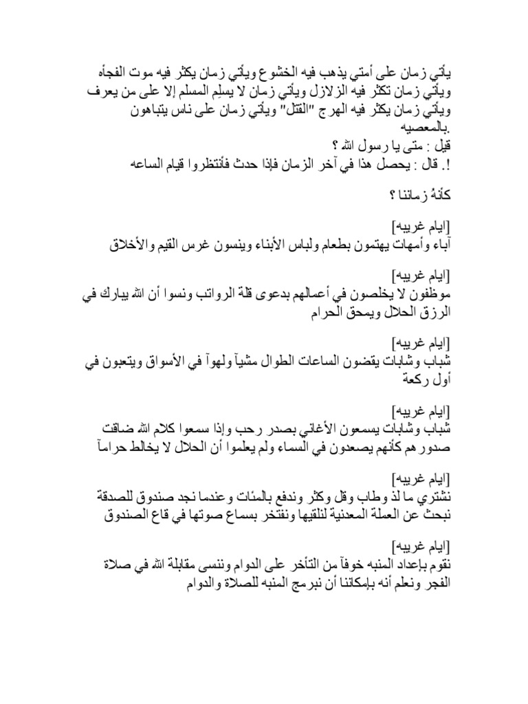 يأتي زمان على أمتي يذهب فيه الخشوع ويأتي زمان يكثر فيه موت الفجأه ويأتي زمان تكثر فيه الزلازل ويأتي زمان لا يسل م المسلم إلا على من يعرف ويأتي زمان يكثر فيه الهرج